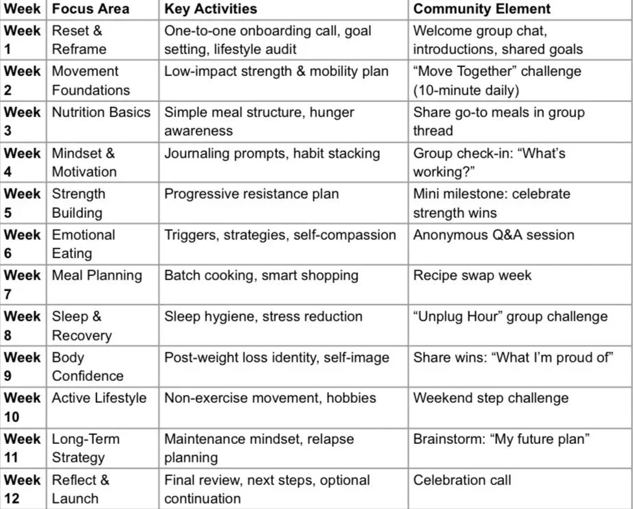 Optional add-ons: One-to-one coaching, nutrition deep dive, custom workouts